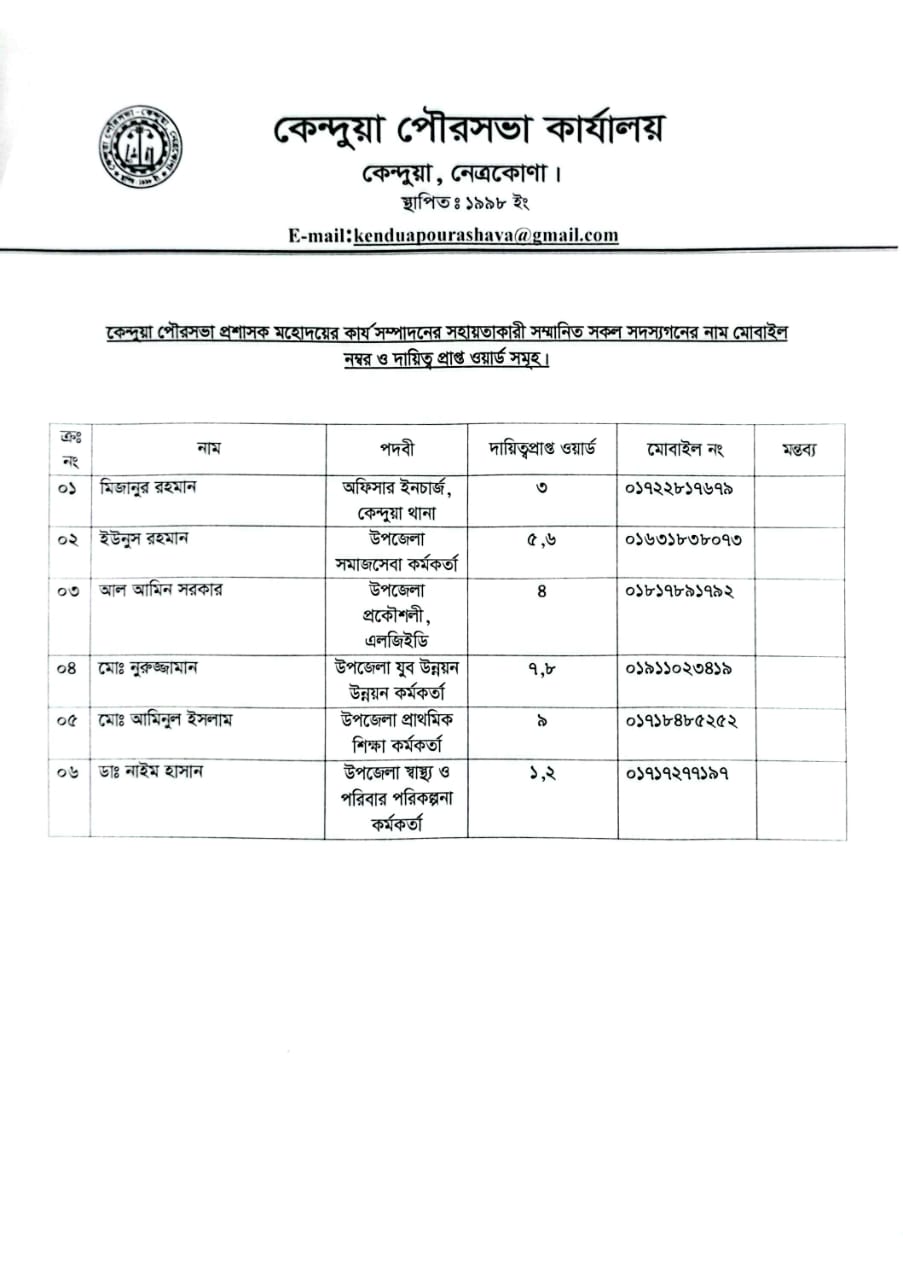 ক্রমিক নং | ওয়ার্ড নং | কান্সিলরগণের নাম | মোবাইল নম্বর |